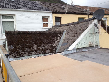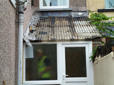 | The pictures show a saddle roof and another lean slate roof behind, both were covered in asbestos slates. The roof was stripped down and disconnected to make way for a new fibreglass flat roof. The remainder of the roof was restated with cement fibre slate. The asbestos slates were disposed of through an official waste company with the appropriate certificates | ||||||||||||||||||||||||||||||||||||||||||||||||||||||||