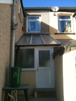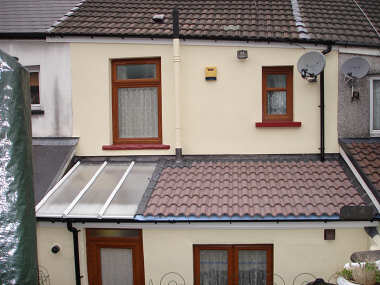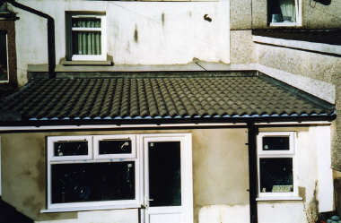 perspex, corrugated asbestos sheets and timbers were removed. New roof timbers were fitted into place and covered in breathable roofing felt and battened then covered in low profile concrete roof tiles, code 4 lead aprons were fitted together with flashings. New purpose made concrete sill fitted to small window. The corrugated perspex roof was replaced with polycarbonate triple glaze pvc with twinfix bars. New pvc facia and rainwater gutters and pipes were fitted into place. New pvc windows and doors fitted in light oak with tilt and turn windows above the conservatory roof and above the tile roof for easy cleaning. The old corrugated asbestos sheets were disposed of correctly and safely by controlled waste management. |