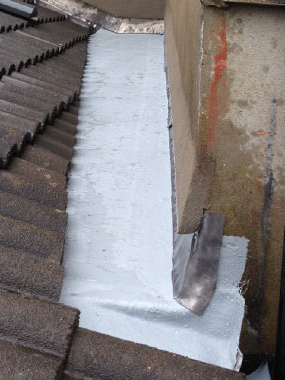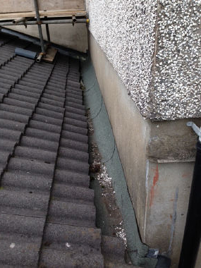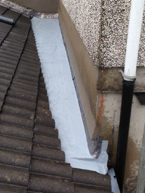 This shows a shot of a valley that has been done wrongly with felt just stuck to the wall and fitted over the existing lead. |