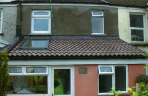 could be fitted. The window was built up approx 500ml and a purpose made concrete sill together with a tilt and turn window fitted in place. Code 4 lead apron fitted where the roof meets the wall and made good with next door's roof with lead flashings. Then felt and batten were fitted and a low profile together with low pitch roof tiles put in place. The corregated asbestos roof were safely disposed of by controlled waste management. |