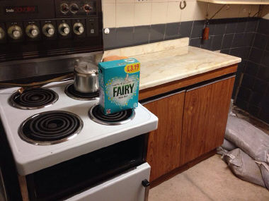 These photos show a small kitchen situated in a basement which developed a problem with a running water from above The kitchen was taken out tiles chipped off the wall and tanking fitted to the walls a landrain fitted around the perimeter and underground pIpe fitted to carry running water approx 4 metres to external drain |